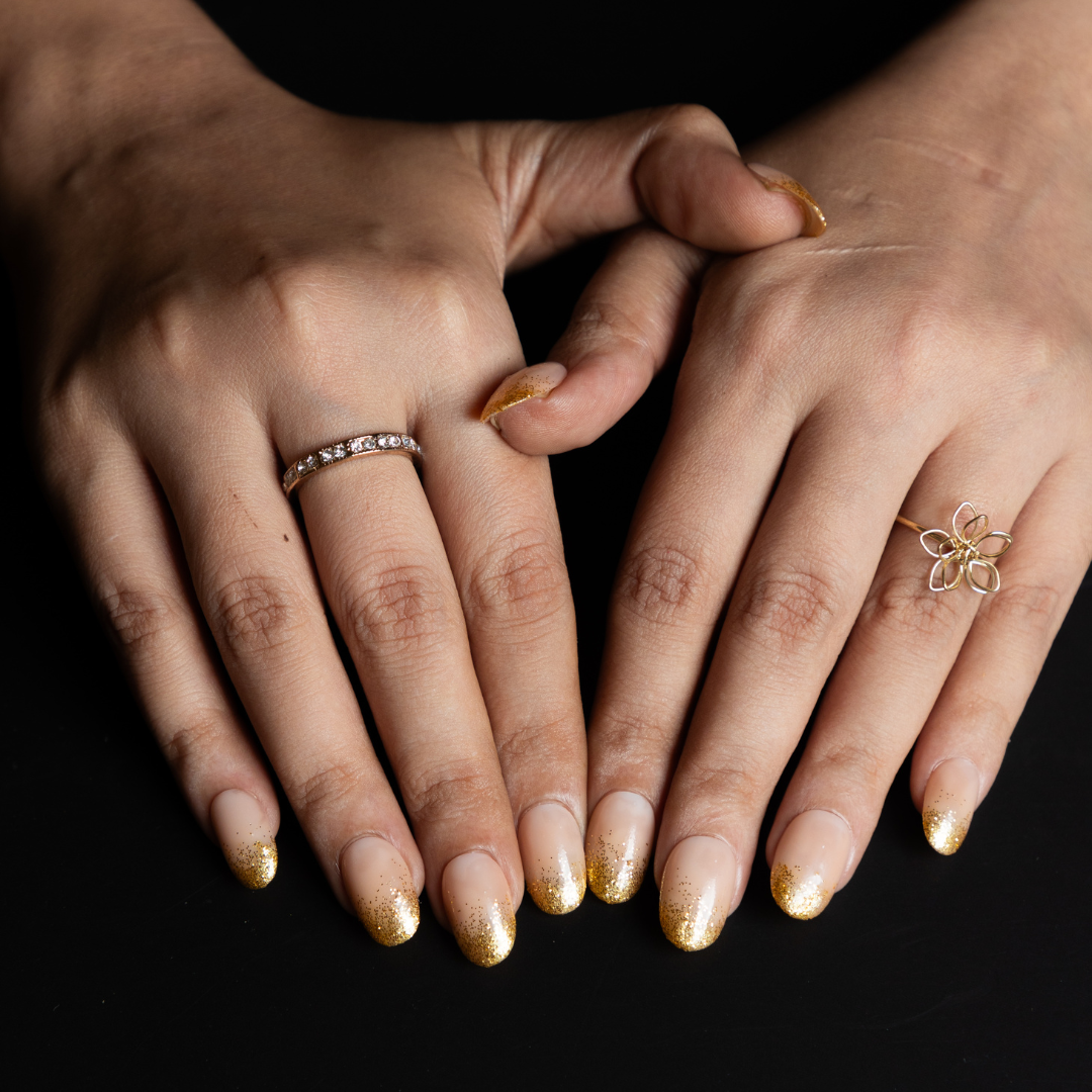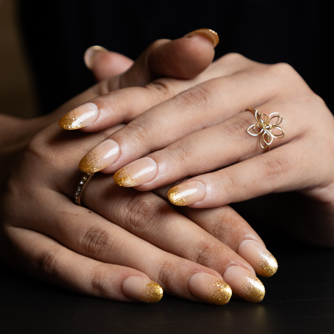To sparkle and shine in the festive and wedding season with our Goldust Nail Set! This chic style brings together the best of both worlds - a classic yet trend-driven look with a scattered "gold" tip on a sleek nude base. With our always-popular short round shape, you'll adore this elevated take that perfectly complements your extravagant wedding or festive outfits.